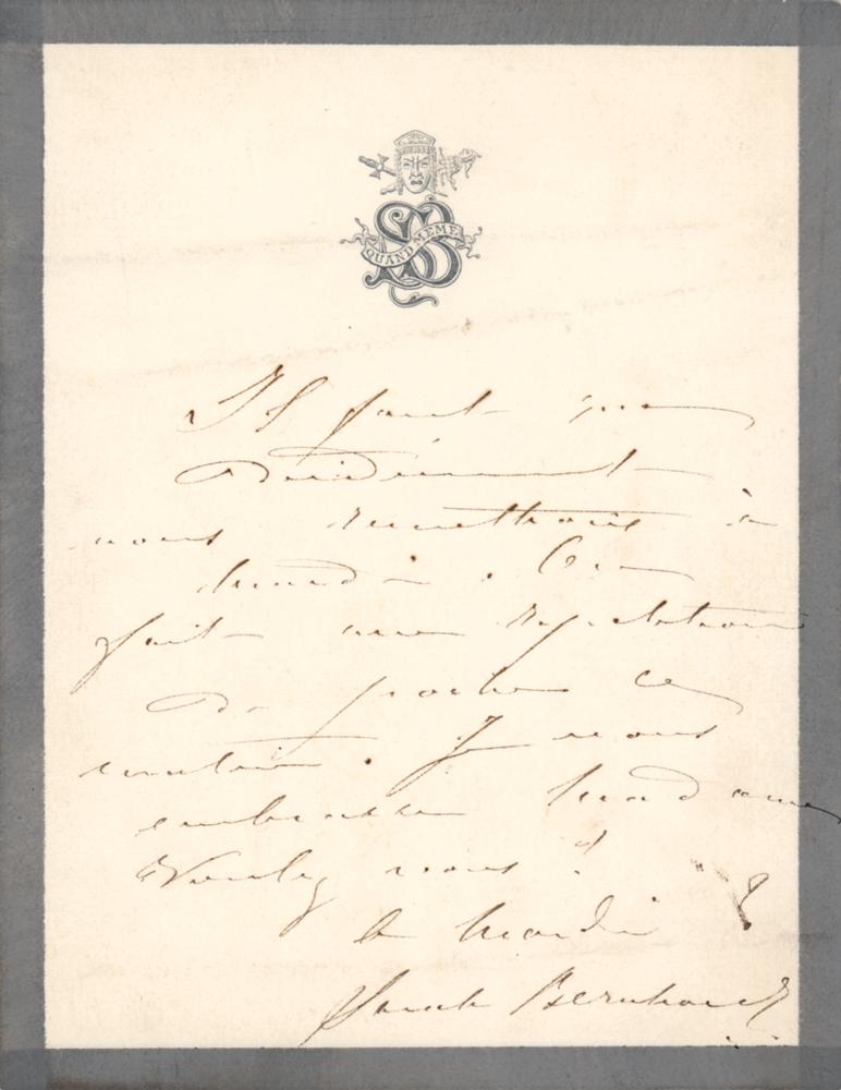 ALS in French, one page, 3.75 x 5, black-bordered personal monogram letterhead, no date. Untranslated handwritten letter by the celebrated French stage actress. In fine condition, with three horizontal creases. Accompanied by the matching envelope.