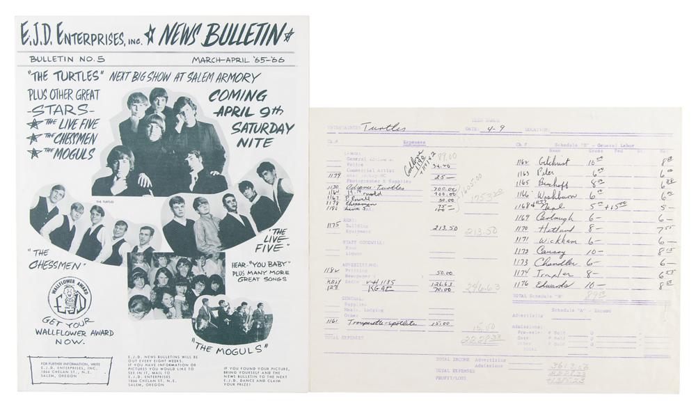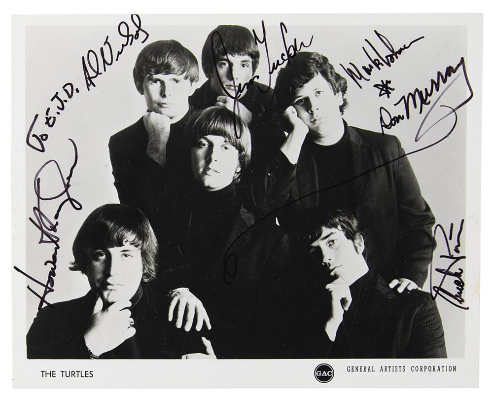 Vintage glossy 10 x 8 General Artists Corporation publicity photo of The Turtles, signed and inscribed in black felt tip to Salem Armory concert promoter Ed Dougherty, "To E. J. D., Al Nichol," "Howard Kaylan," "Jim Tucker," "Mark Volman," "Don Murray," and "Chuck Portz.” In very good to fine condition, with scattered light creasing. Accompanied a bulletin advertising The Turtles' show at the Salem Armory on April 9, 1966, and Dougherty's expense report for the concert.