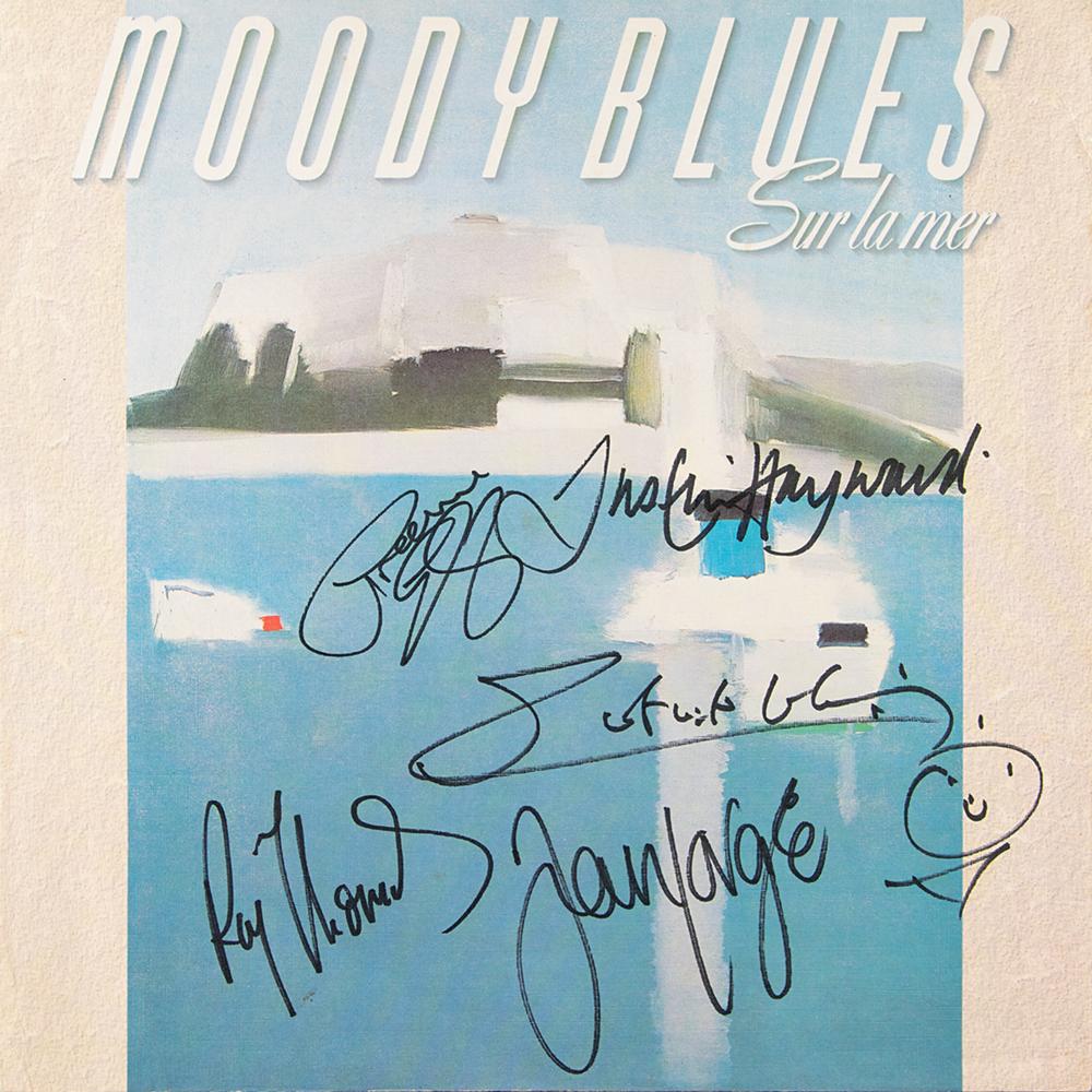 Sur la Mer album flat signed on the front in black felt tip by Justin Hayward, John Lodge, Graeme Edge, Patrick Moraz, and Ray Thomas. In fine condition. Consignor notes that the signatures were obtained at Miami Arena on November 9, 1988.