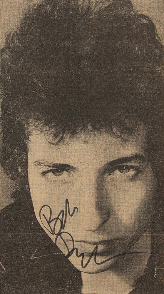 Magazine or newspaper photo of a young Bob Dylan looking directly into the camera, 4.25 x 7.75, signed in black felt tip by the poet and folk music icon. Matted to an overall size of 8.5 x 11.75. In fine condition, with some soiling to the mat. Accompanied by a full letter of authenticity from REAL.