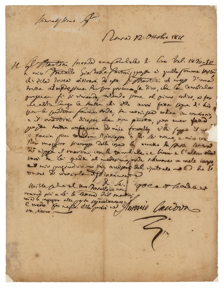 Italian sculptor (1757-1822) known for his neoclassical marble nudes. Uncommon ALS in Italian, one page, 7.25 x 9.5, October 12, 1811. Handwritten letter to Dominico Selva of the House of Papadopoli, regarding financial payments involving his brother. Addressed on the reverse in Canova's hand. In very good to fine condition, with some light staining, and repaired paper loss to the edges.