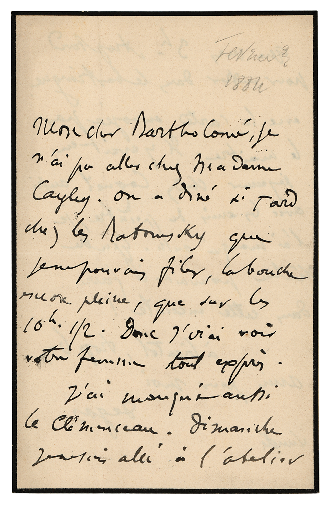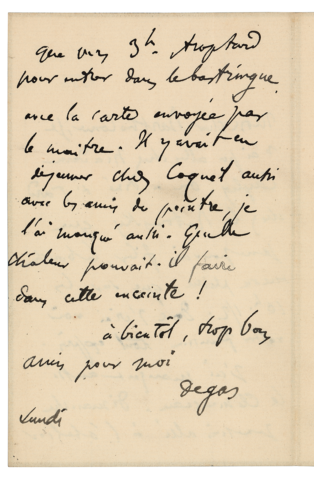 ALS in French, signed “Degas,” one page both sides, 4.5 x 7, [February 3, 1884, dated in another hand]. Handwritten letter to the sculptor Albert Bartholomé, in full: "I couldn’t go to Mrs. Kaley because we had dinner so late at the house of the Ratowsky that I could not leave my mouth till full only at about 10:30. So I will go and see your wife expressly. I also missed Clemenceau on Sunday I went to the Atelier. I could only go to the Atelier around 3. Too late to be authorized to enter with the cards that were sent by the master. There had been a luncheon with Coquet also with the friends of the painter and I also missed it. What an incredible heat within that place. See you later. You are too good a friend to me." In fine condition.