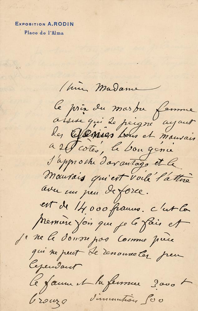ALS in French, signed “A. Rodin,” two pages on two adjoining sheets, 5.25 x 8.25, Exposition A. Rodin, Place de l'Alma letterhead, no date. Handwritten letter discussing his sculptures and their potential sale, while also referring to the painter and printmaker Paul-Albert Besnard. In part (translated): "The price of my seated woman combing her hair having good and bad angels on her side, the good angel approaching closer and the bad who is veiled is pushing her with more strength is of fourteen thousand francs.