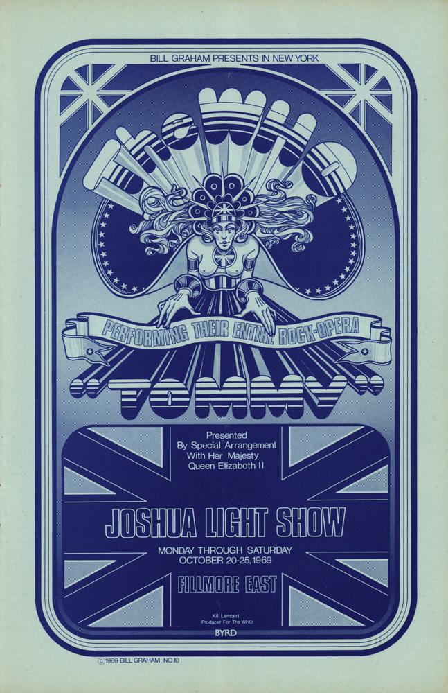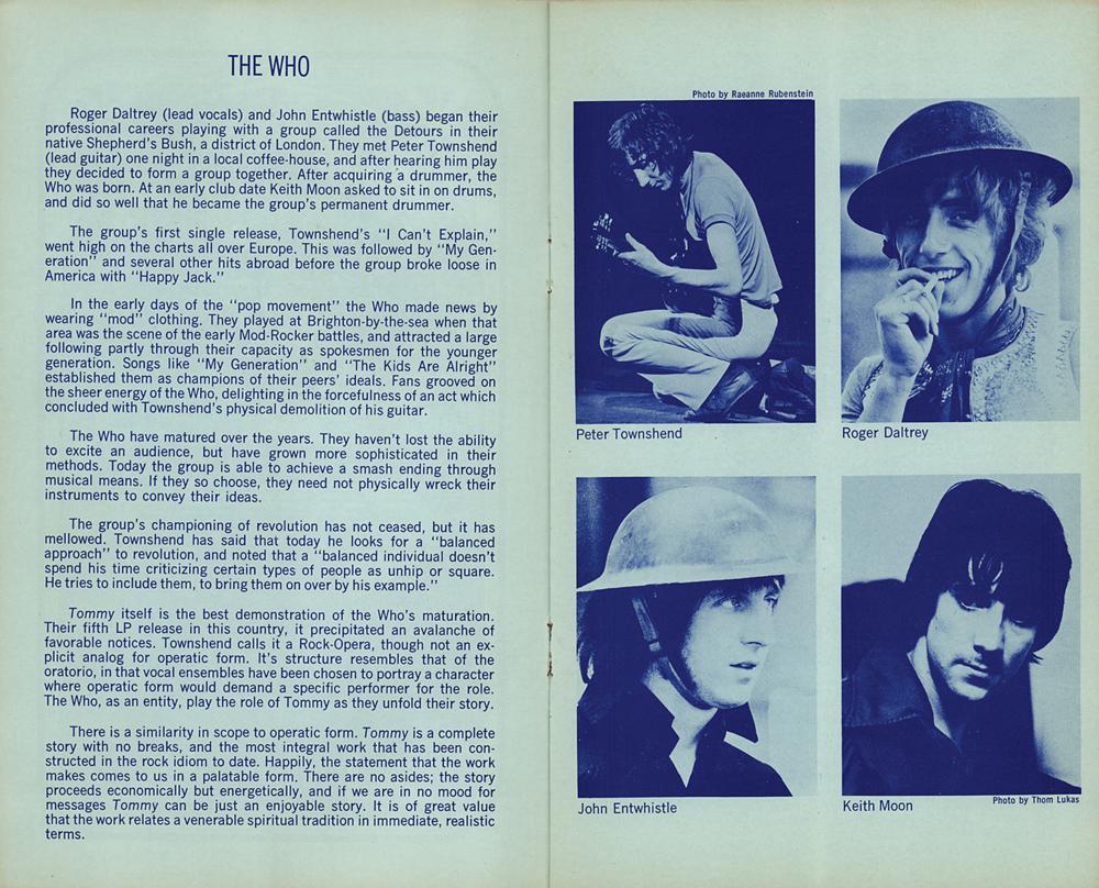 Very desirable Fillmore East program for The Who's legendary six-night concert stand in which they performed the newly released Tommy in its entirety at the aforesaid theatre on October 20-25, 1970. The program measures 5.5 x 8.5 and features a special blue 12-page insert dedicated to this remarkable run of performances, including song lyrics, a plot description of the rock opera, and various photos and period advertisements highlighted by a full-page promo for The Who's Tommy. The program also features advertisements for The Electric Circus, Crosby, Stills, & Nash, Country Joe and the Fish, and The Kinks. In very good to fine condition, with light handling wear and a central vertical fold.