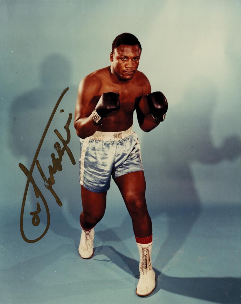 Color glossy 8 x 10 full-length photo of Joe Frazier striking a pugilistic pose, prominently signed in gold ink. In fine condition.