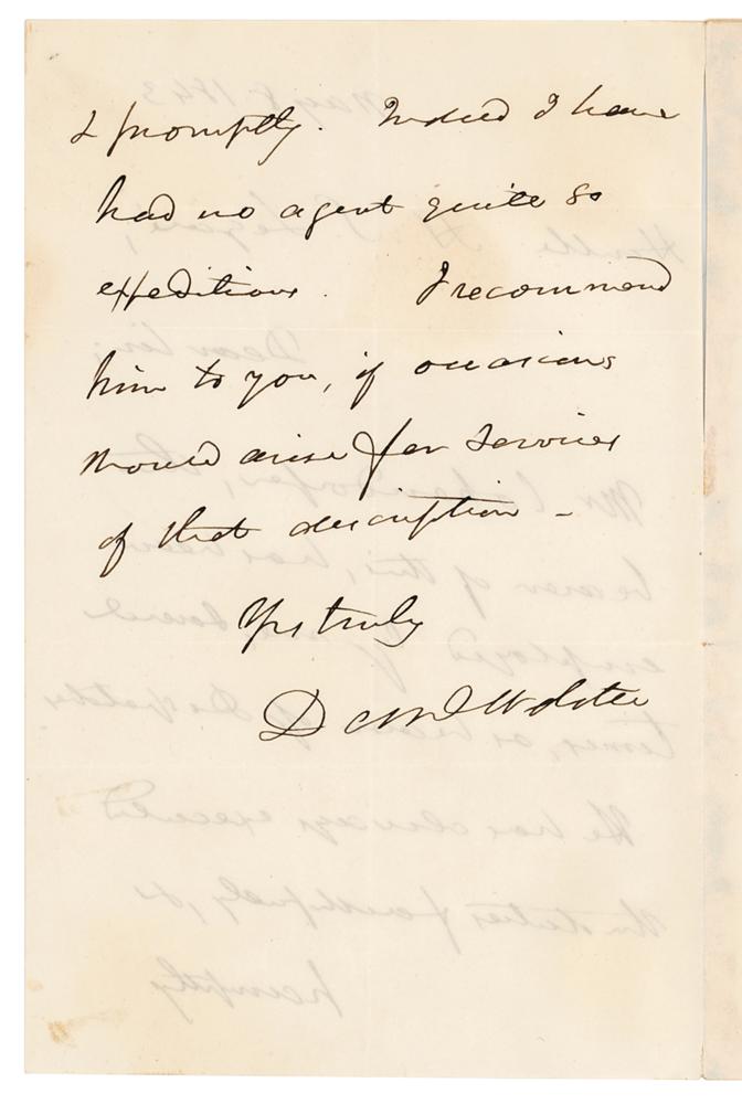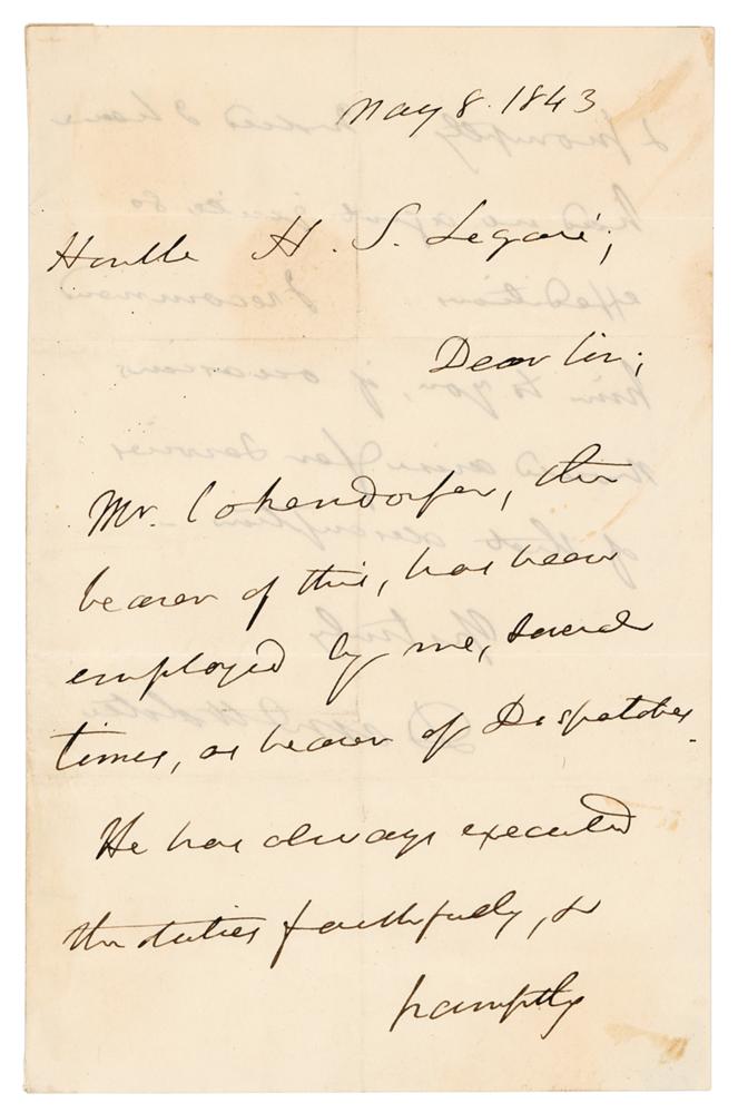 ALS signed “Dan'l Webster,” one page both sides, 4.75 x 7.25, May 8, 1843, his last day in office as U.S. Secretary of State. Handwritten letter of recommendation to Attorney General Hugh S. Legare, who would replace Webster as ad Interim U.S. Secretary of State the following day. In full: “Mr. Cohendorfer, the bearer of this, has been employed by me, several times, as bearer of Dispatches. He has always executed the duties faithfully, & promptly. Indeed, I have had no agent quite so expeditious. I recommend him to you, if occasions should arise for services of that description.” In very good to fine condition, with scattered light staining, and partial separation along the hinge.