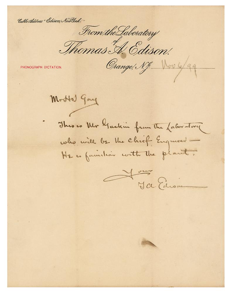 Scarce ALS signed “T. A. Edison,” one page, 8.5 x 11, ‘From the Laboratory of Thomas A. Edison’ letterhead, November 6, 1899. Handwritten letter to H. J. Gay, in full: “This is Mr. Gaskin from the Laboratory who will be the Chief Engineer—He is familiar with the plant.” In fine condition, with some faint toning, and a couple of small stains.