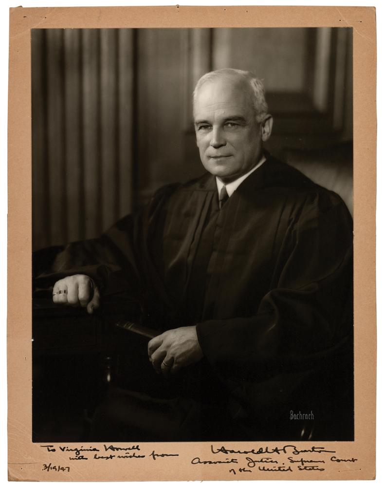American politician and lawyer (1888-1964) who served as the 45th mayor of Cleveland, as a U.S. Senator from Ohio, and as an Associate Justice of the Supreme Court of the United States, in which capacity he wrote the majority opinion in Joint Anti-Fascist Refugee Committee v. McGrath (1951) and Lorain Journal Co. v. United States (1951). He also helped shape the Court's unanimous decision in Brown v. Board of Education (1954). Matte-finish 7.25 x 9.25 Bachrach photo of Burton seated in his judicial robe, affixed to the original 8.25 x 10.75 mount, signed and inscribed on the mount in the lower border in fountain pen, “To Virginia Howell, with best wishes from, Harold H. Burton, Associate Justice, Supreme Court of the United States, 3/19/47.” In very good to fine condition, with corner creasing, staple holes to the edges, and some light silvering to the image.