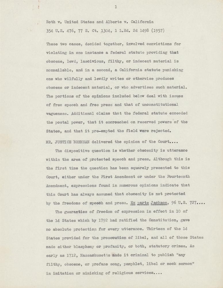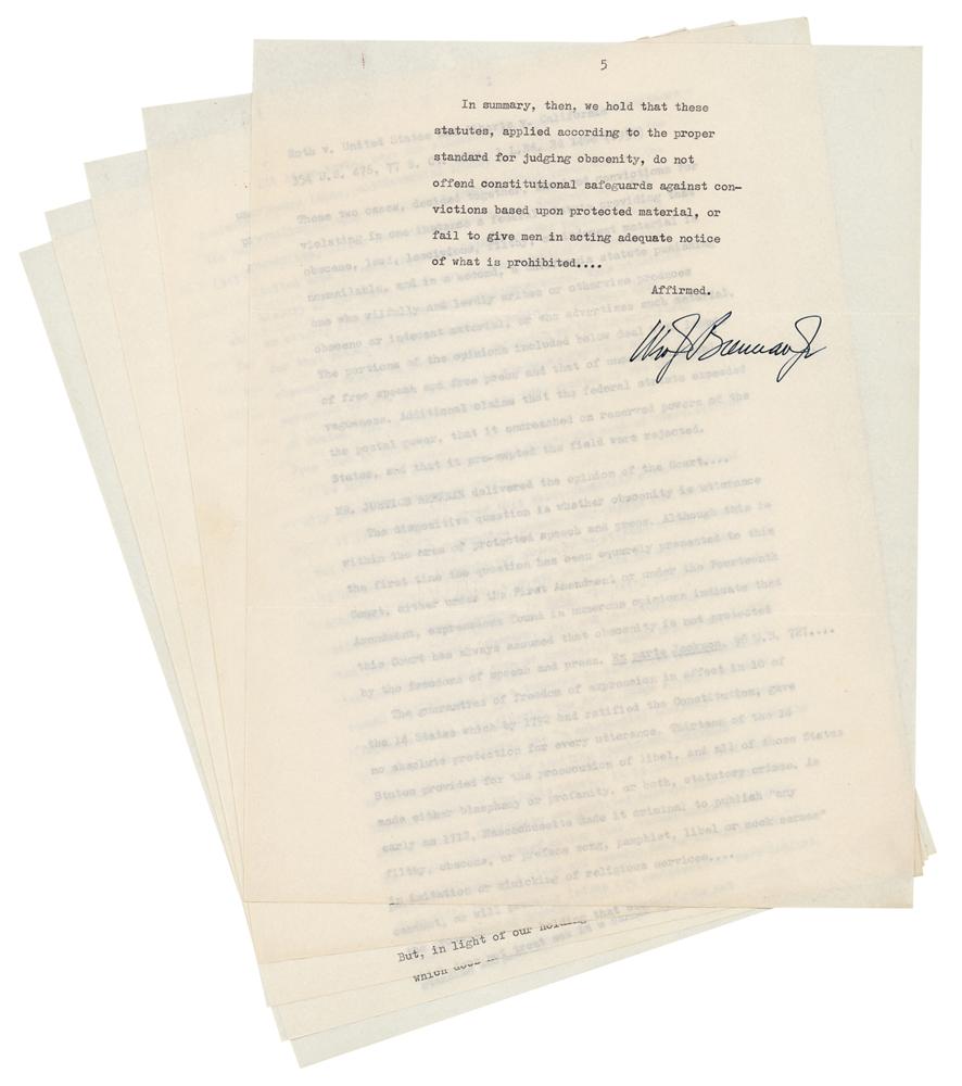 Typescript of the Warren Court opinion of the Roth v. United States, 354 U.S. 476 case of 1957, five pages, 8.5 x 11, as authored by William J. Brennan, Jr., who has signed the last page in black ink, “Wm. J. Brennan, Jr.” In fine condition.