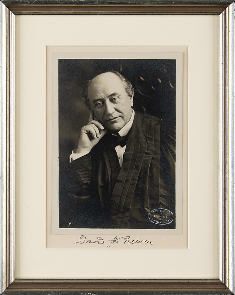 American attorney and jurist (1837-1910) who served as an Associate Justice of the Supreme Court of the United States for 20 years. Matte-finish 4.5 x 6.5 photo of David J. Brewer by the Harris & Ewing studio, signed on the original mount in black ink. Lower right corner of photo bears the Harris & Ewing blindstamp. Matted and framed to an overall size of 8.5 x 10.75. In very good to fine condition, with silvering to the perimeter of the image. We have never before offered a signed photograph of the longtime Supreme Court justice.