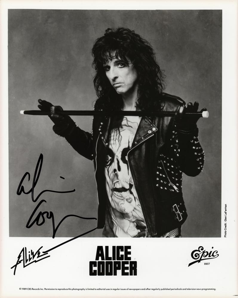 Accompanied by a glossy 8 x 10 Eric Records publicity photo of Cooper wearing the aforementioned shirt with artwork design, which is signed in black felt tip by Cooper, and by a signed letter of provenance from Brumitt: "I Eric (Airic) Brumitt painted this 24 x 24 Alice Cooper ½ Skull in my 27th year in 1987?This painting represents the culmination of my desire to work for Alice Cooper since discovering him in 1971?I would up working for Alice Cooper for 21 years forward after the creation of this image & painting. Many pieces were created and used throughout that time. This is the image people remember more than any other.”