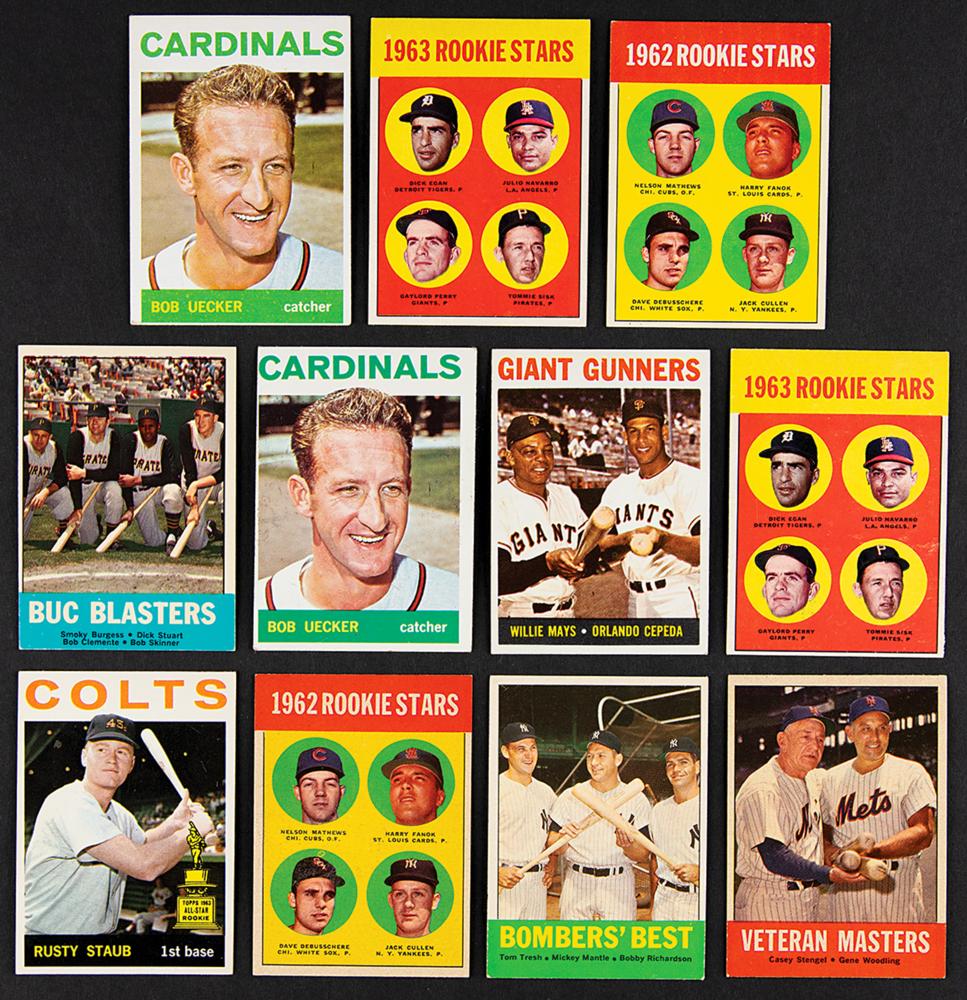 1964 Topps (4): #109 Rusty Staub (EX), #306 Giant Gunners with Willie Mays and Orlando Cepeda (EX), and #543 Bob Uecker (2: VG, VG-EX)