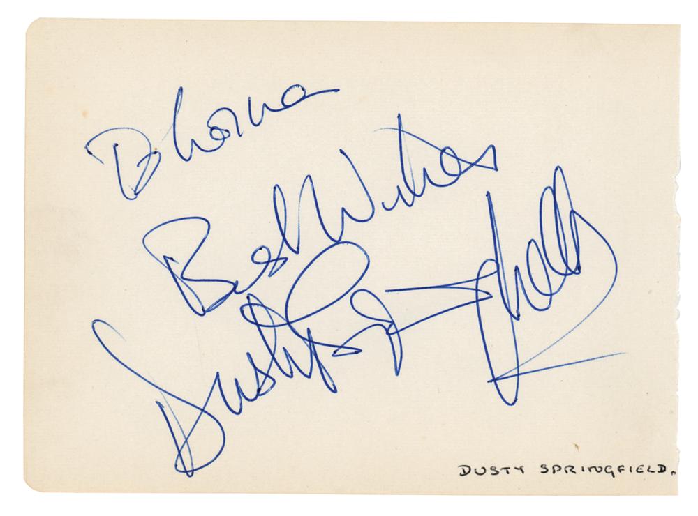 Ballpoint signature and inscription, "To Lorna, Best wishes, Dusty Springfield,” on an off-white 5 x 3.75 album page. The consignor notes that the autograph dates to the 1960s. In very fine condition. Accompanied by a certificate of authenticity from Tracks.