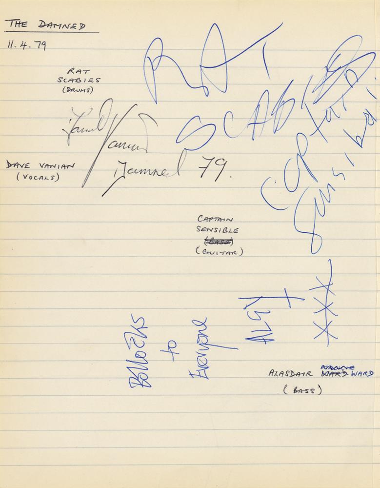 Off-white 7 x 9 notebook page signed in black ballpoint, “David Vanian, Damned 79,” and in blue ballpoint, “Rat Scabies,” “Captain Sensible,” and “Bollocks to everyone, Algy, xxx.” Collector’s notation dates the autographs to April 11, 1979. Includes another notebook page signed by Public Image Ltd members Keith Levene and Jim Walker. In fine condition. Accompanied by a certificate of authenticity from Tracks.
