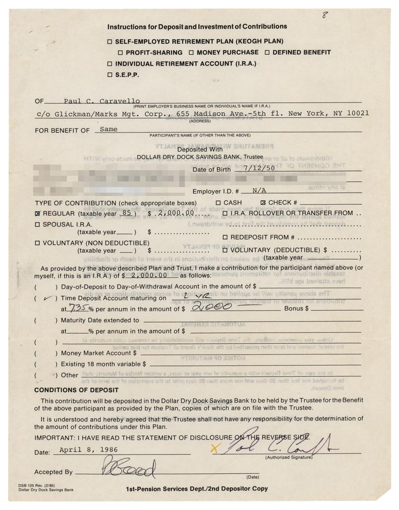 DS, signed “Paul C. Caravello,” one page, 8.25 x 11, April 8, 1986. Retirement plan policy for KISS drummer Eric Carr, which was taken out with Dollar Dry Dock Savings Bank by KISS management company Glickman/Marks. Signed at the bottom by Eric Carr in black ink with his legal name Paul Caravello. In fine condition. Accompanied by certificates of authenticity from Tracks and Backstage Auctions, the latter of which has been signed by Eric’s sister, Loretta Caravello.