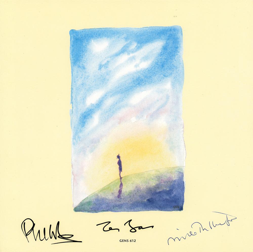 Limited edition color 11 x 11 print that was included with select copies of the 12-inch Genesis single record ‘No Son of Mine,’ signed on the front in black felt tip by Phil Collins and Tony Banks, and in blue ballpoint by Mike Rutherford. The record’s catalog number “GENS 612” is printed at the bottom. In fine condition. Accompanied by a certificate of authenticity from Tracks.