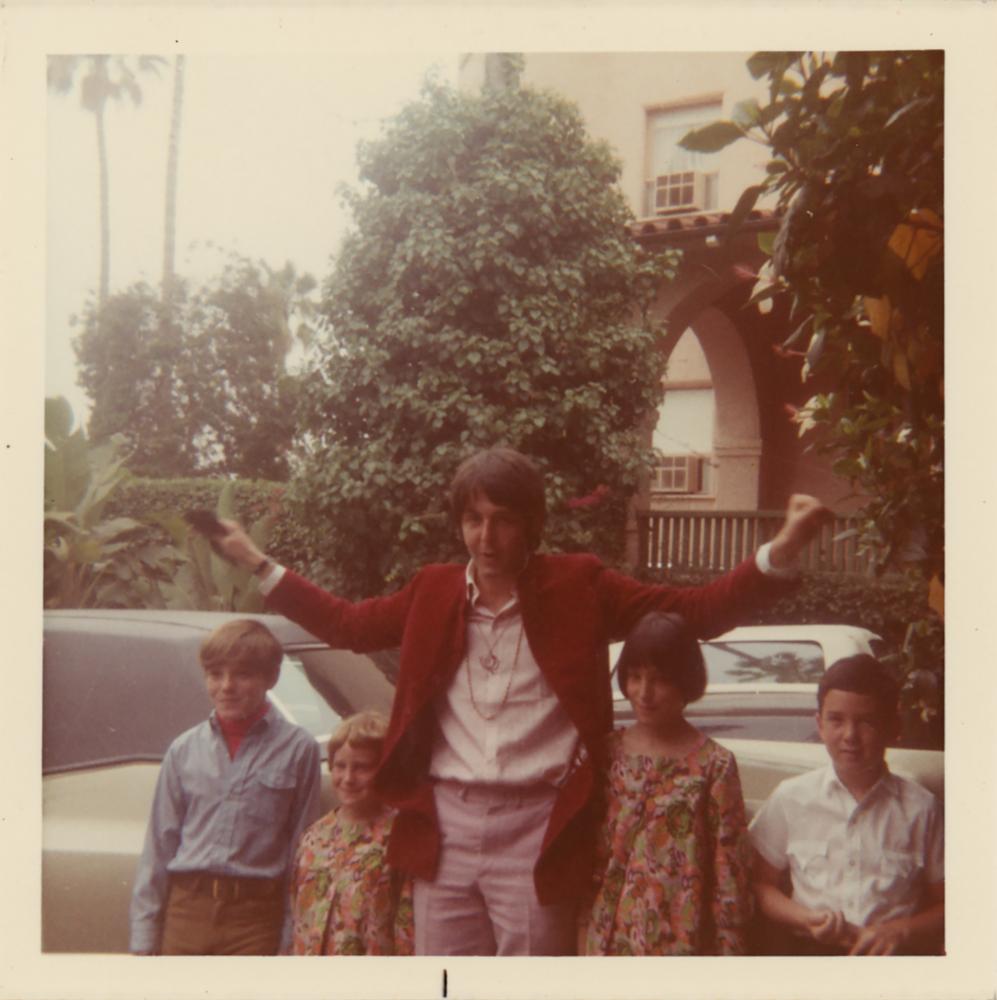 Original vintage color glossy 3.5 x 3.5 snapshot photograph of Paul McCartney that has been developed from the original negative in 1968. The photograph, which was taken outside the Beverly Hills Hotel in Los Angeles, California, between June 21 and 25, 1968, shows McCartney surrounded by children. The Beatles bassist was in LA with Tony Bramwell and childhood friend Ivan Vaughan to promote their Apple label to Capitol Records. It was also on this trip that McCartney met up for the second time with his future wife Linda Eastman; he had called her from a stop-over in New York and left a message saying he was staying at the Beverly Hills Hotel, where they met up a couple of days later. In fine condition. Accompanied by a certificate of authenticity from Tracks.