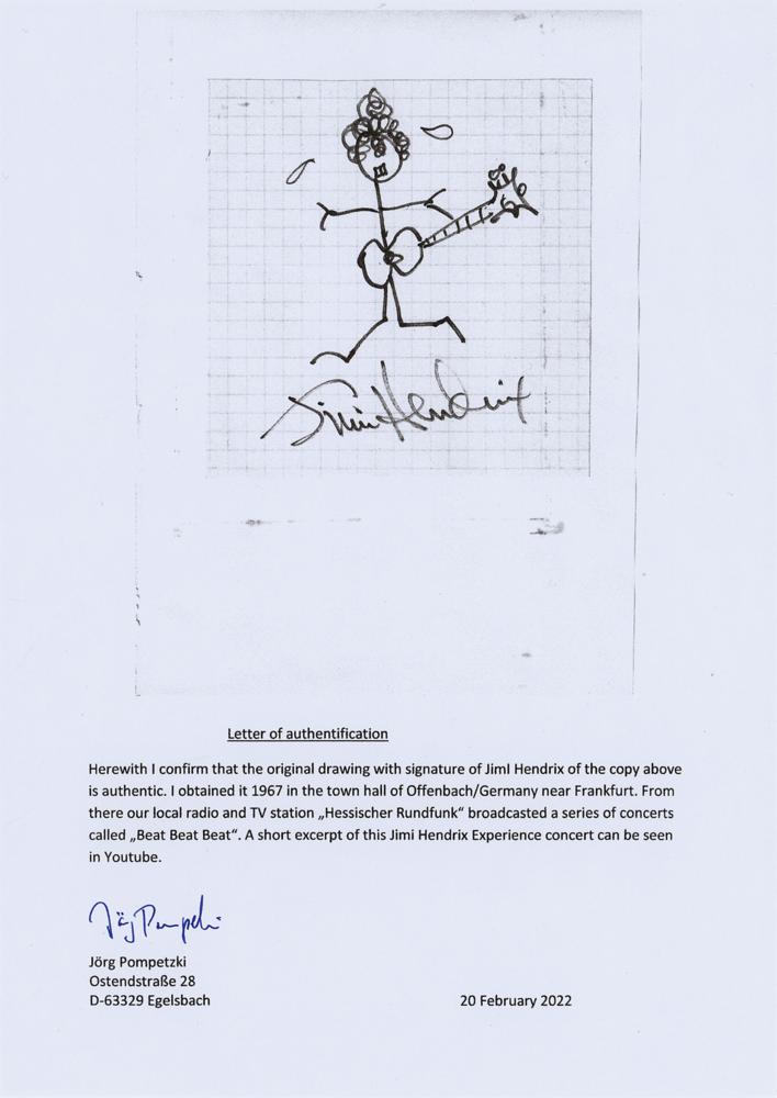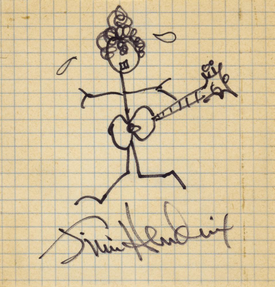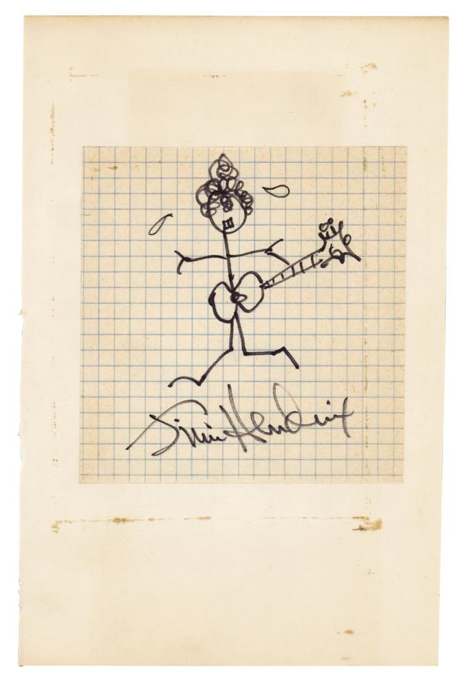 Rare original self-portrait sketch by Jimi Hendrix, depicting himself in stick figure form, sweating with a guitar strapped to his waist, accomplished in black felt tip on an off-white 4 x 4.25 sheet of notebook paper that is signed neatly below, “Jimi Hendrix.” The sketch is likewise affixed to a 5.25 x 8.25 backing sheet. Interestingly, Hendrix has drawn himself playing guitar right handed, but the distinctive curly hair can be clearly discerned as his own. In fine condition. The consignor notes that the sketch was drawn at the Stadhalle in Offenbach, Germany, on May 18, 1967, when Hendrix was at the venue to perform on a television and radio show called ‘Beat Beat Beat.’