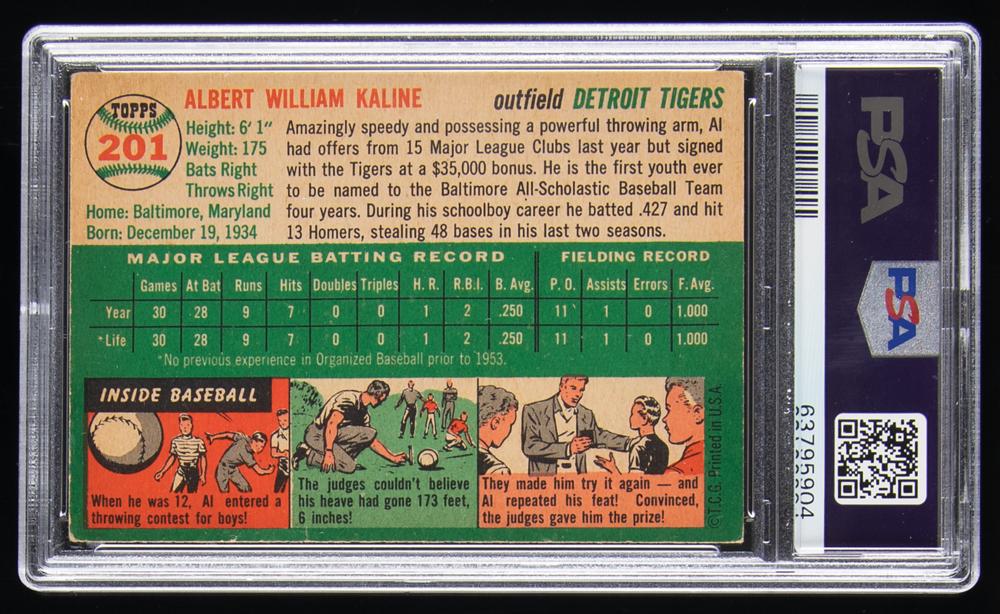 Graded by PSA VG-EX 4. Classic rookie card of the Detroit Tigers Hall of Famer, featuring a wonderful color portrait, black-and-white full-length pose, and the young slugger's facsimile signature against a bright orange background. The card is well-centered with vivd colors and an even glossy sheen. The youngster’s confidence is exposed by the smirk in his portrait: after a modest first season, he would go on to lead the Majors in hits (200) and batting average (.340) in 1955. During his 22-year career, Kaline would attain 3,007 hits while walloping 399 homers.