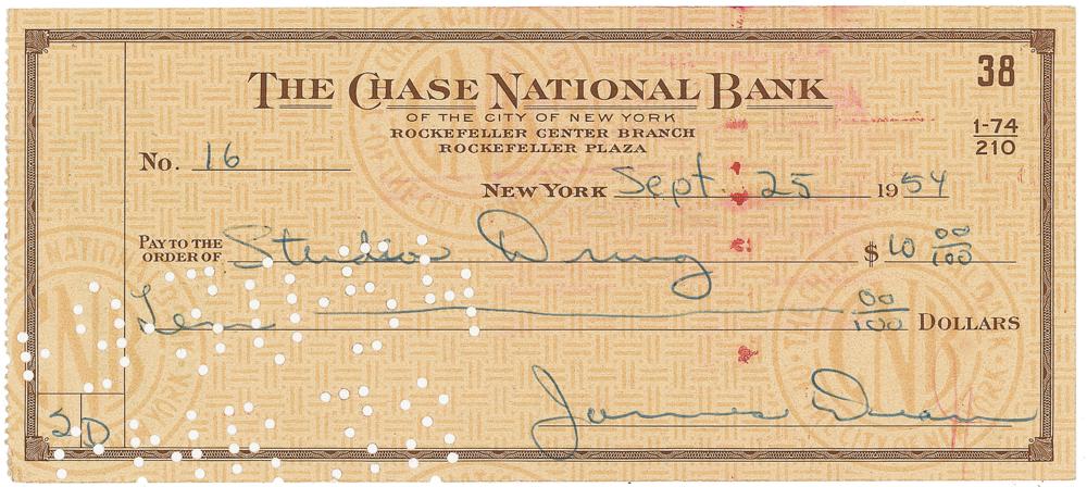 Chase National Bank check, 6.25 x 2.75, filled out and signed by James Dean, payable to Studio Drug for $10, September 25, 1954. In fine condition. Accompanied by a vintage glossy photo of Dean with actress Terry Moore at the premiere of the film Sabrina on September 22, 1954, a few days before Dean signed this check.
