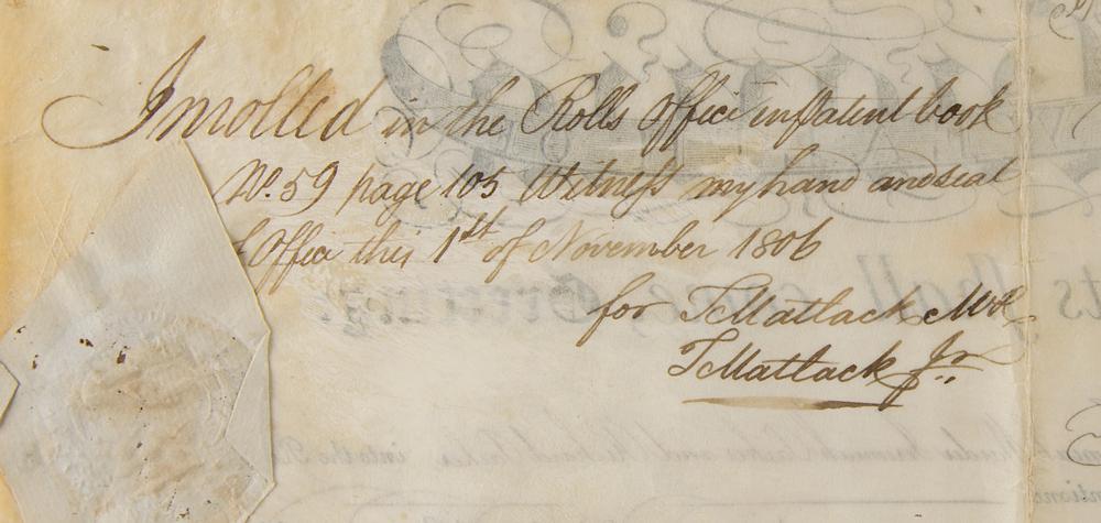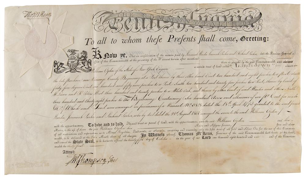 Partly-printed vellum DS, signed “Tho's M:Kean,” one page, 20.25 x 11.75, October 25, 1806. As governor of Pennsylvania, McKean grants William Ogden of the State of New York a "certain tract of land, called 'Land’s down’—situate in?Orange County?Containing Six hundred Acres.” Signed in the upper left by Governor McKean and countersigned at the conclusion by his nephew, Thomas McKean Thompson, as deputy secretary. The seal affixed to the upper left remains intact. Also endorsed on the reverse by Timothy Matlack, the engrosser of the Declaration of Independence. In fine, folded condition, with some old tape residue in the lower left corner.