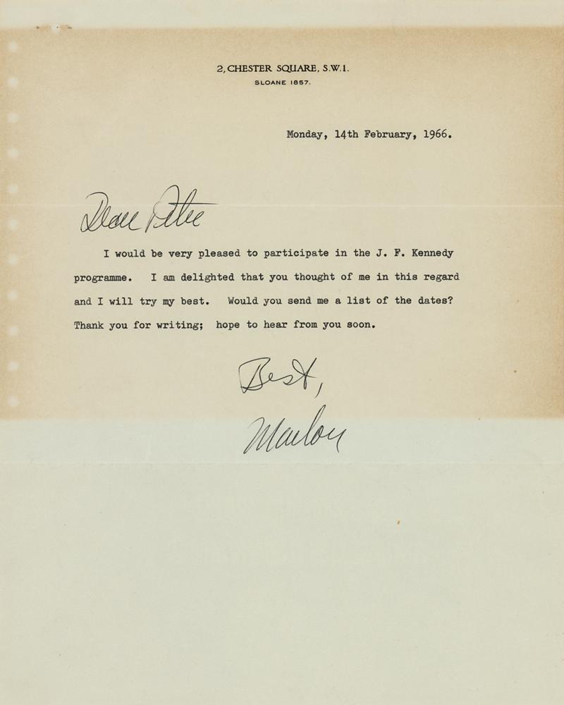 Scarce TLS signed "Best, Marlon," one page, 8 x 10, personal letterhead, February 14, 1966. Letter to Peter Lawford. In part: "I would be very pleased to participate in the J. F. Kennedy programme. I am delighted that you thought of me in this regard and I will try my best. Would you send me a list of the dates?" Brando also writes "Dear Peter" at the top of the letter. In fine condition, with a uniform block of toning. Accompanied by two retained carbon copies of letters from Lawford to Brando, and a six-page carbon copy of the treatment for the program, entitled "'J.F.K.: The Man' (A Television Series)," to be produced by Chislaw Productions in association with Allan Jay Friedman. The treatment lists a number of stars who committed to hosting the show, including Richard Burton, Laurence Olivier, Sidney Poitier, Burt Lancaster, and Fredric March, in addition to Brando; Alan Jay Lerner and Budd Schulberg were also to work on the script. An exceptionally desirable letter associating these Hollywood legends with President John F. Kennedy.