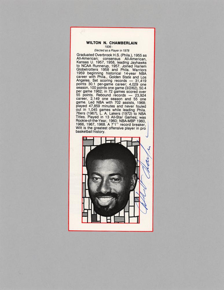 Biography for NBA legend Wilt Chamberlain clipped from a program, 3.265 x 7.75, signed vertically next to his image in blue ink. Affixed to a gray 8.5 x 11 backing sheet. In fine condition.