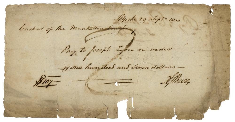 Manuscript DS, signed “A. Burr,” one page, 8 x 4, September 29, 1800. Pay order issued to the "Cashier of the Manhattan Company," requesting that $107 be paid to "Joseph Lyon or order." Neatly signed below by Aaron Burr. In very good to fine condition, with toning, tears, and loss to the edges, not at all affecting the signature. A month later at the 1800 United States presidential election, the Democratic-Republican ticket of Thomas Jefferson and Aaron Burr edged Federalists John Adams and Charles C. Pinckney. An unintentional electoral college tie between Burr and Jefferson resulted in the House of Representatives voting in Jefferson's favor, with Burr becoming Jefferson's vice president due to receiving the second-highest share of the votes. Although Burr maintained that he supported Jefferson, the president was highly suspicious of Burr, who was relegated to the sidelines of the administration during his vice presidency and not re-nominated as Jefferson's running mate in 1804.