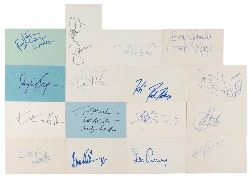 Exceptional collection of 400+ celebrity autographs from the realms of stage, screen, music, and politics. Dating to the 1970s, the vast majority of the signatures are penned on off-white 5 x 3 cards, with some inscribed and some duplicates. Highlights include: Cary Grant, Paul Simon, Arnold Schwarzenegger, Sean Connery, Gilda Radner, Katharine Hepburn, Andy Kaufman, Pete Townshend, John Entwistle, Ingrid Bergman, Ray Bolger, Rick Nelson, Joni Mitchell, Brian Wilson, Mike Love, Bruce Johnston, John Travolta, Eartha Kitt, Mel Torme, Frankie Valli, Tina Turner, Mike Wallace, Ted Kennedy, Rick Wakeman, Nancy Wilson, Gene Wilder, Sigourney Weaver, Meryl Streep, Jessica Tandy, Peter Frampton, Bill Withers, Robert Wagner, James Earl Jones, Dolly Parton, Michael Palin, Warren Beatty, Colin Blunstone, Adrienne Barbeau, Charles Grodin, Arlo Guthrie, Alex Haley, Olivia de Havilland, Freddie Prinze, Tony Curtis, Billy Crystal, Bing Crosby, Ron Howard, Paul Kantner, Ethel Kennedy, Carly Simon, Dinah Shore, Talia Shire, Teddy Pendergrass, Johnny Paycheck, Peter Boyle, Jimmy Durante, Jamie Farr, Mia Farrow, Matt Dillon, Donovan, Michael Douglas, Richard Dreyfus, Sam Elliott, Robert Goulet, Angie Dickinson, Bruce Dern, Brian DePalma, Pam Grier, and many more. In overall fine condition.