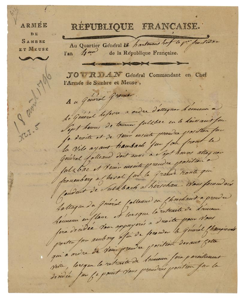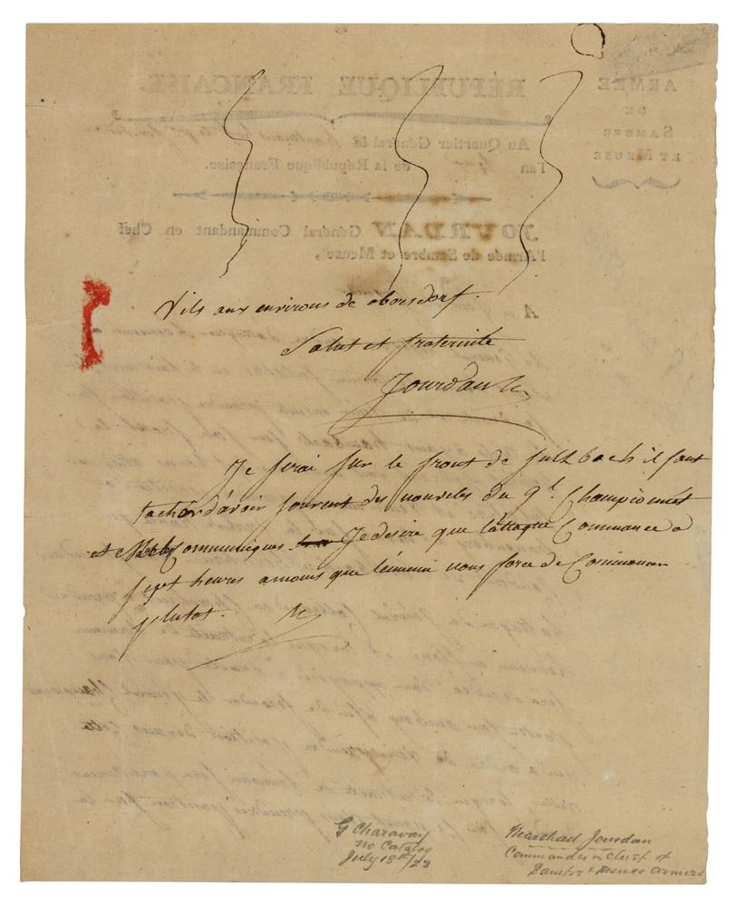 French military commander (1762-1833) who served during the French Revolutionary Wars and the Napoleonic Wars, remembered for his decisive victory over the First Coalition at the Battle of Fleurus during the Flanders campaign. He was made a Marshal of the Empire by Napoleon Bonaparte in 1804. ALS in French, signed “Jourdan,” one page both sides, 7.25 x 9, Army of Sambre-et-Meuse letterhead, August 18, 1796. Untranslated handwritten letter by Jourdan to "General Grenier" on military matters. In fine condition.
