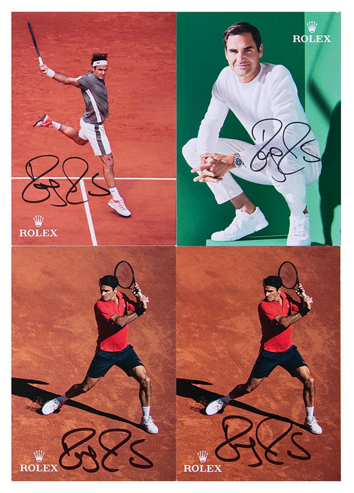 Four color promo cards for Rolex, 4 x 5.75, each signed in black felt tip by tennis legend Roger Federer. In overall very fine condition.