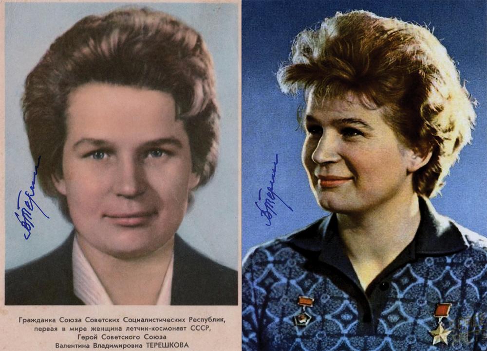 Two color glossy 5 x 7 close-up photos of the first woman in space, both signed in blue felt tip by Valentina Tereshkova. In overall very fine condition.