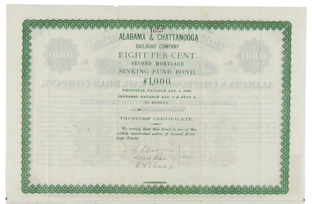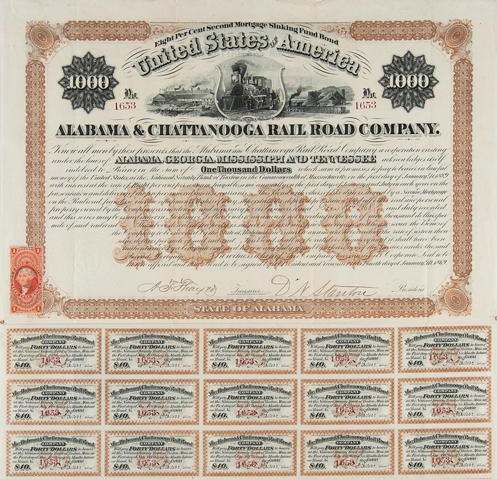Large $1000 bond of the Alabama & Chattanooga Rail Road Company issued January 4, 1869, 14.25 x 21.25, with 36 coupons intact below. The bond carries a rate of 8% and features a fine vignette of railroad scenes. Signed at the conclusion by the company's president and treasurer. In fine condition.