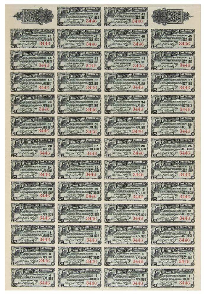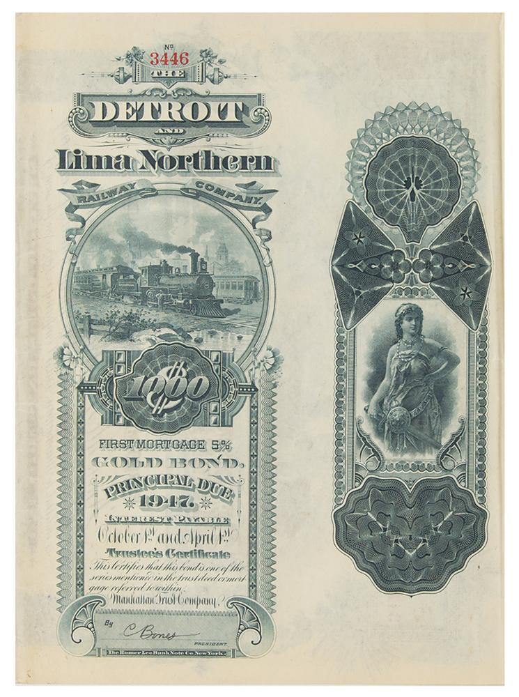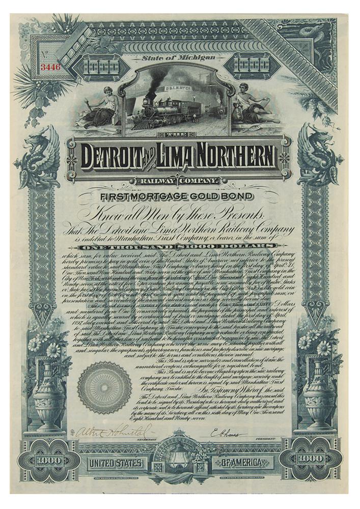 Handsome $1000 bond of the Detroit and Lima Northern Railway Company issued May 6, 1897, 10 x 14, complete with its 100 coupons attached. Carrying a rate of 5% payable in "gold coin," the bond boasts an ornate blue border and a detailed allegorical vignette with locomotive at center. Signed at the conclusion by the company's president and secretary. In fine condition.