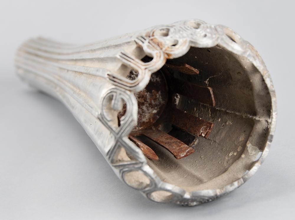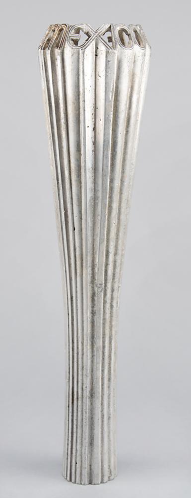 Official 'Type 1' torch from the historic Mexico City 1968 Summer Olympics, which is comprised of white cast metal with a plain unadorned handle, measuring 17.25″ in length and 4.25″ at its widest point. The white cast metal body is fully grooved and the top features "Mexico 68" twice around the rim. The robust torch bears overall scattered wear, marks, and small dents, instances of pitting (apparently from the casting process), and some soiling. The torch relay recreated the route taken by Christopher Columbus to the New World, beginning on August 23, 1968, in Olympia, Greece. It notably traveled through Columbus's birthplace in Genoa, where he set sail from Palos in Spain, and the first land he reached in San Salvador. In all, there were 2,778 torchbearers on the 13,546 km route.