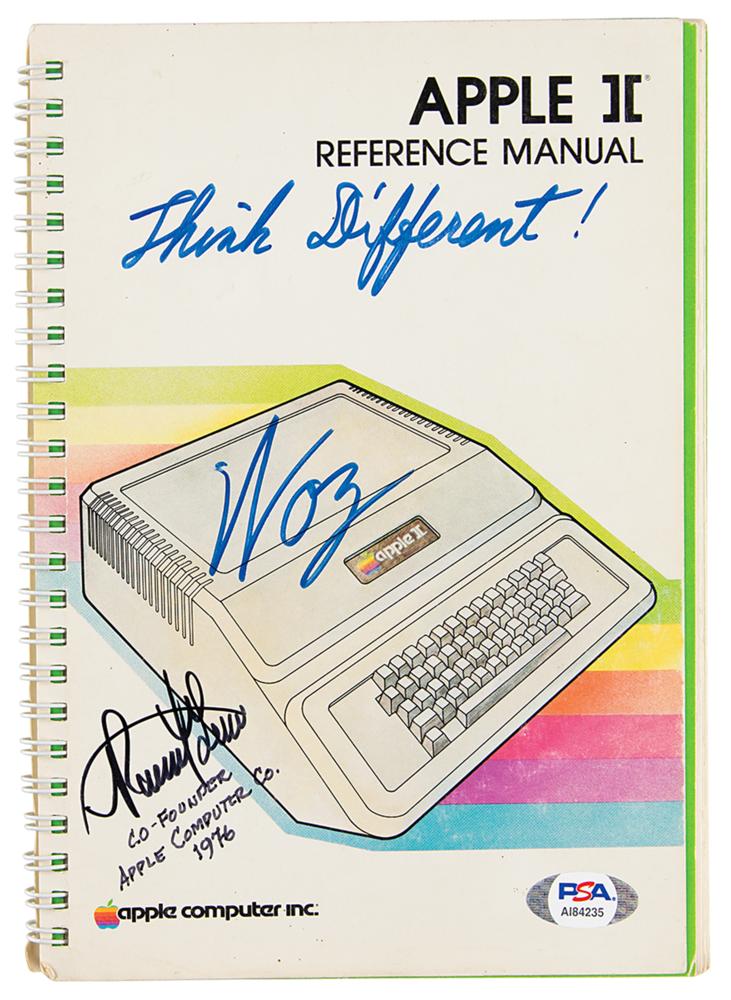 Spiral-bound Apple II reference manual, 196 pages, 6 x 8.5, signed on the front cover in blue felt tip, "Think Different! Woz" and "Ronald Wayne, Co-Founder, Apple Computer Co., 1976." Complete with its addendum insert. In fine condition, with light handling wear, a previous ownership notation to first page, and a PSA/DNA label affixed to the corner of the cover (certificate of authenticity not present).