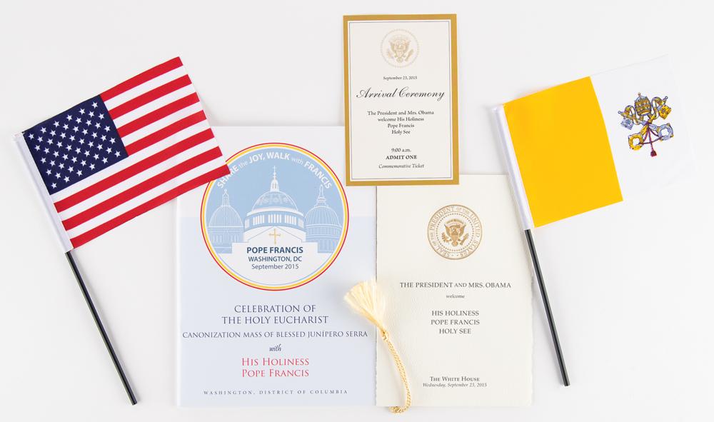 Ephemera from the official visit of Pope Francis to Washington, D.C., in September 2015, including: a commemorative ticket to the "Arrival Ceremony" for Pope Francis; an official program for the arrival ceremony hosted at the White House by President Barack Obama and First Lady Michelle Obama; and an official program for the mass at the Basilica of the National Shrine of the Immaculate Conception for the canonization of Blessed Junipero Serra with His Holiness Pope Francis. Also includes two miniature flags of the United States and Vatican City. In overall very fine condition.