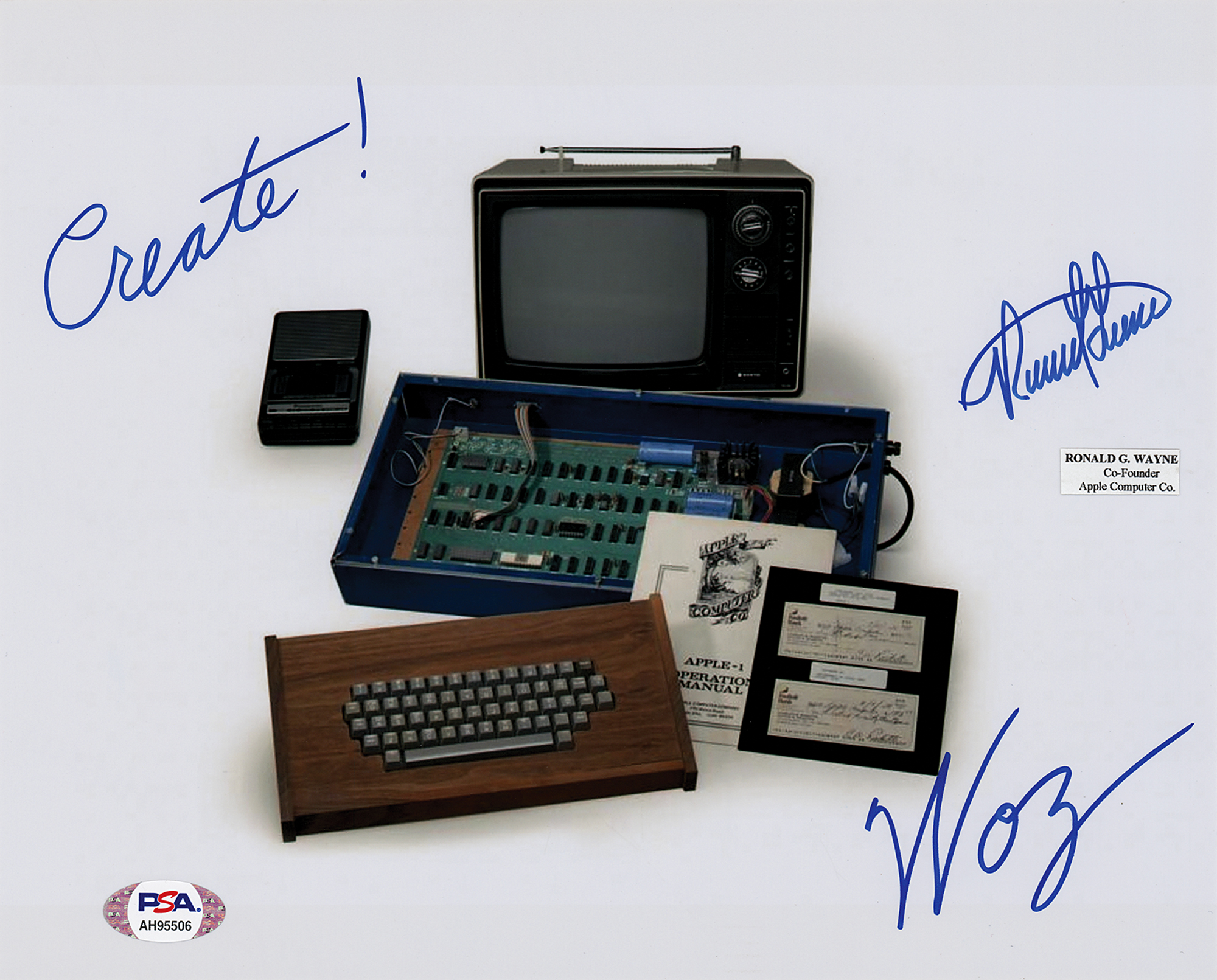 Color satin-finish 10 x 8 photo of an Apple-1 Computer setup, signed in blue felt tip by Steve Wozniak, "Create! Woz," and by Ron Wayne, "Ronald Wayne," over his embossed personal seal, with small biographical label applied below. In very fine condition, with a PSA/DNA label affixed to the lower left corner. Accompanied by a certificate of authenticity from PSA/DNA.