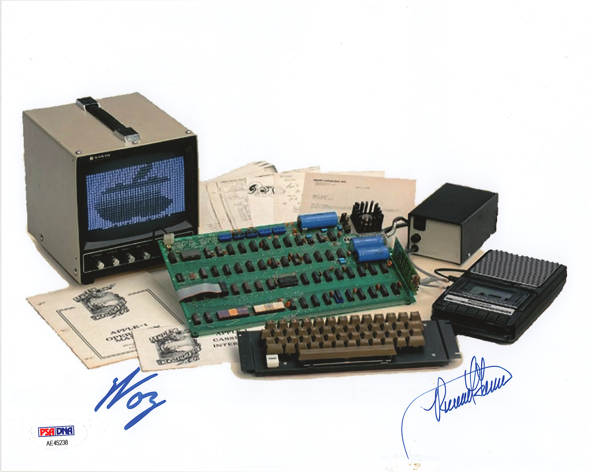 Color satin-finish 10 x 8 photo of an Apple-1 Computer setup, signed in blue felt tip by Steve Wozniak, "Woz," and by Ron Wayne, "Ronald Wayne." In very fine condition, with a tiny stain below Wayne's signature, and a PSA/DNA label affixed to the lower corner (certificate of authenticity not present).