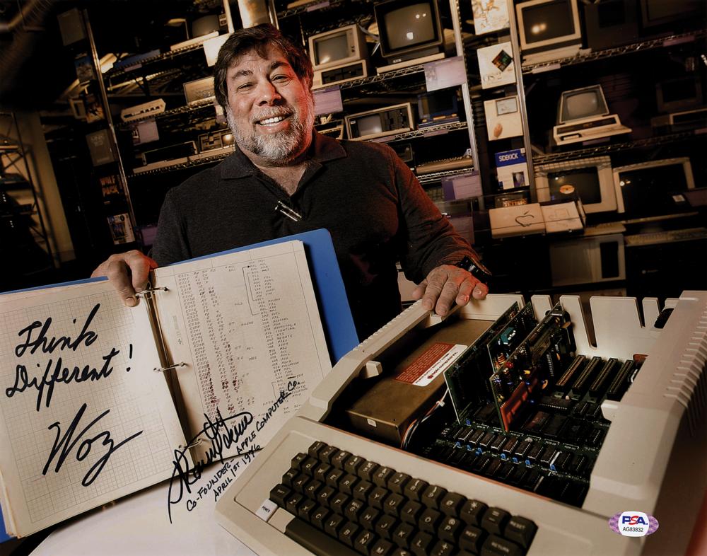 Color satin-finish 14 x 11 photo of Woz posing with an Apple II computer and a binder of notes on his circuit design, signed in black felt tip by Steve Wozniak, "Think Different! Woz," and by Ron Wayne, "Ronald Wayne, Co-Founder - Apple Computer Co., April 1st, 1976," over his embossed personal seal. In very fine condition, with a PSA/DNA label affixed to the lower right corner. Accompanied by a certificate of authenticity from PSA/DNA.
