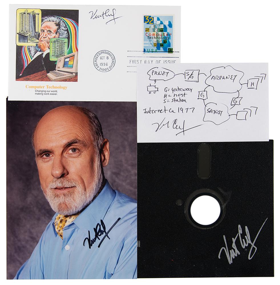 American Internet pioneer (born 1943) and one of 'the fathers of the Internet,' who developed TCP/IP technology and the first commercial email system. Four items signed by Cerf: a desirable hand-drawn sketch of the "Internet ca. 1977," showing the gateways, hosts, and stations interconnecting ARPANET, SATNET, and PRNET; a glossy 5 x 7 portrait; a black 5.25″ floppy disk; and an FDC honoring computer technology. In very fine condition.