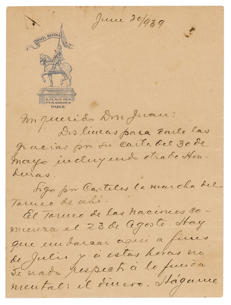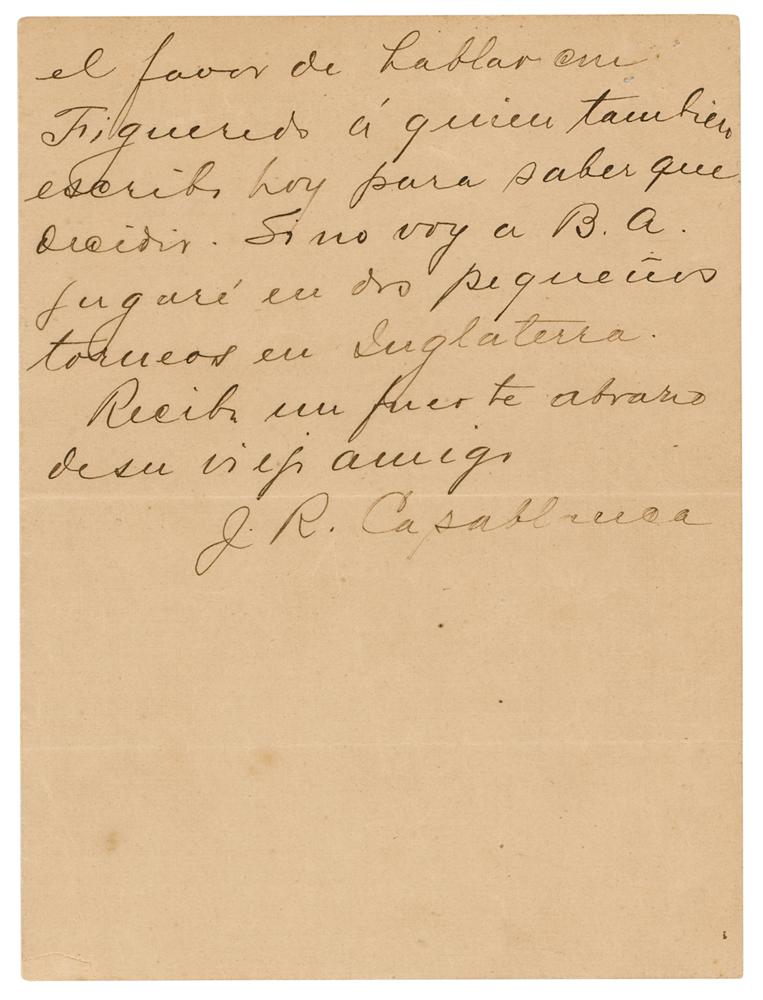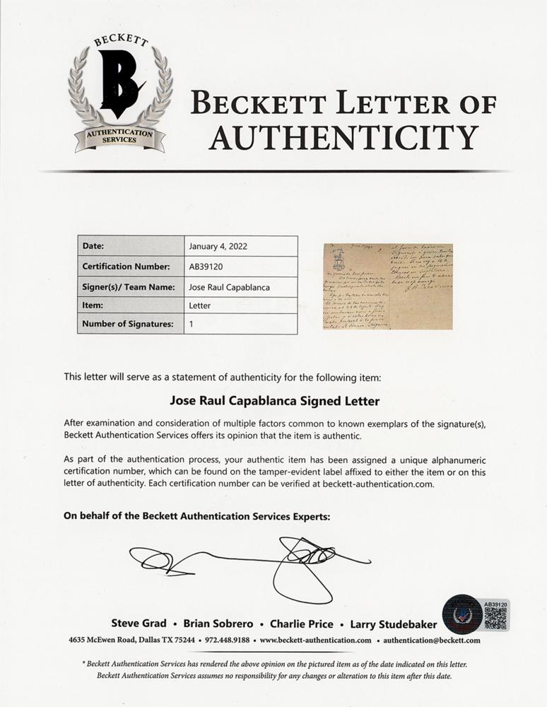 World-champion Cuban chess player (1888-1942) considered one of the greatest of all time. ALS in Spanish, signed “J. R. Capablanca,” two pages on two adjoining sheets, 5.25 x 7, June 20, 1939. Handwritten letter to fellow Cuban chess champion Juan Corzo, who years earlier had passed the torch to Capablanca, which discusses the latter's potential participation in the historic 8th Chess Olympiad in Buenos Aires. In full (translated): “Two lines to thank you for your letter of May 30, including another from Honduras. I follow the march of the Tournament there on posters. The Tournament of Nations begins on August 23. Would have to embark here at the end of July and at this time I do not know anything about the fundamental: money. Please talk to Figueredo [Migeul Figueredo, president of the Havana Chess Club] who I also write to today to find out what to decide. If I don’t go to B.A. I will play in two small tournaments in England. Get a big hug from your old friend.” In fine condition, with scattered small stains, and trivial loss to the bottom edge of the signed page. Accompanied by a full letter of authenticity from Beckett Authentication Services. Capablanca writes from Paris, where shortly thereafter he and his wife would be guests of the President of France at a celebration of the non-aggression pact signed by Germany and France. Capablanca would ultimately attend and star at the Olympiad, which would be famously interrupted by World War II, and won its top individual prize. It was Capablanca’s last ever tournament.