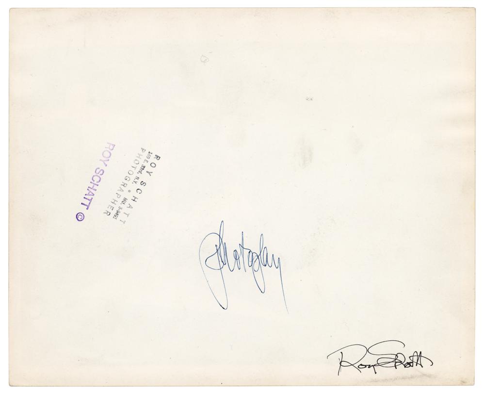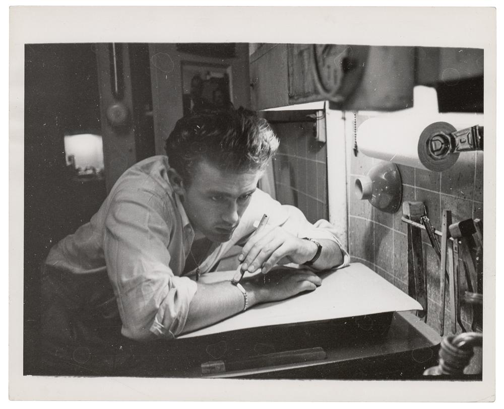 Original vintage glossy 10 x 8 photo of James Dean by photographer Roy Schatt, which depicts the actor seated at a darkroom desk in Schatt’s studio at 149 East 33rd Street in New York City in 1954, signed in black ink by Schatt on the reverse, which is annotated “Photoplay,” and bears two of his credit stamps. In fine condition, with a crease to the lower left corner, and emulsion irregularity in the top border.