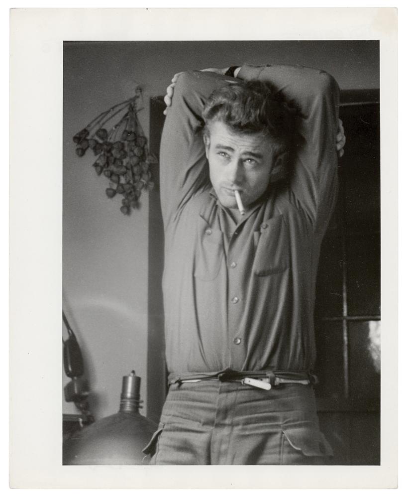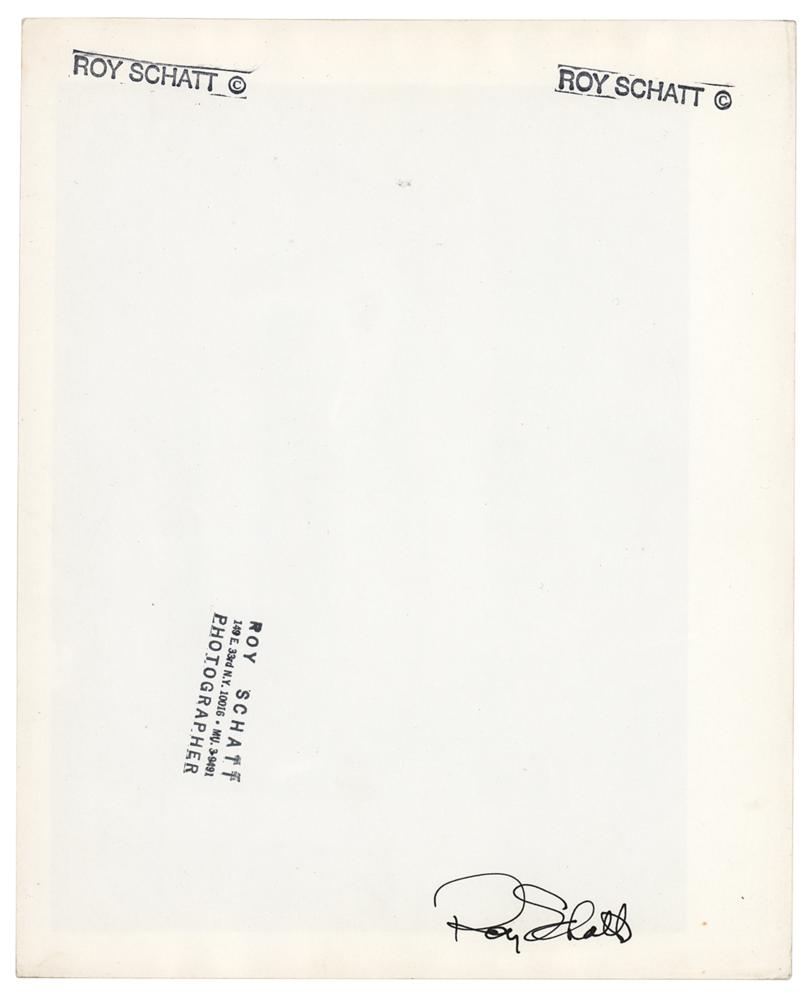 Original vintage glossy 8 x 10 photo of James Dean by photographer Roy Schatt, which depicts the actor smoking a cigarette in Schatt’s studio at 149 East 33rd Street in New York City in 1954, signed in black ink by Schatt on the reverse, which bears three of his credit stamps. In fine condition, with scattered light creases, and emulsion irregularity in the side borders.
