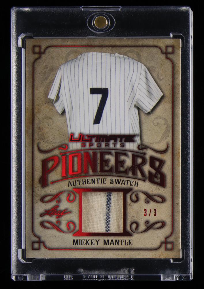 Ultra-limited relic card of New York Yankees legend Mickey Mantle, numbered 3/3, featuring a pinstriped game-used swatch of uniform material.