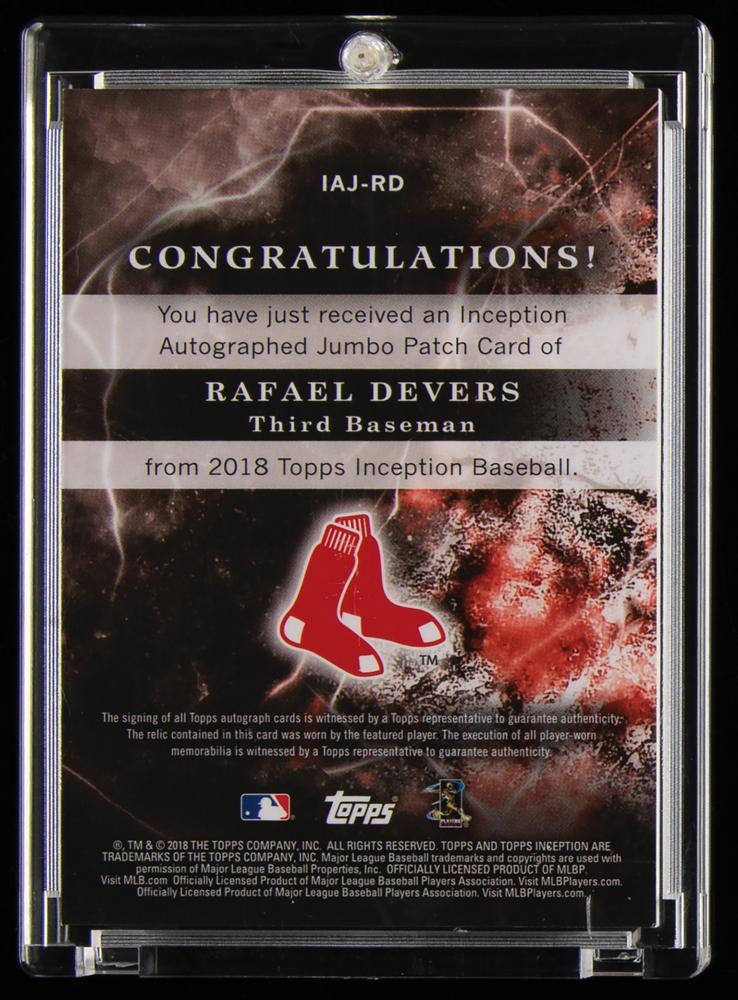 Fabulous autographed jumbo relic card of Boston Red Sox rookie slugger Rafael Devers, numbered 91/99, boasting a fine blue felt tip signature and a huge player-worn swatch with red piping against white fabric. A great signed rookie card of Boston's budding star.