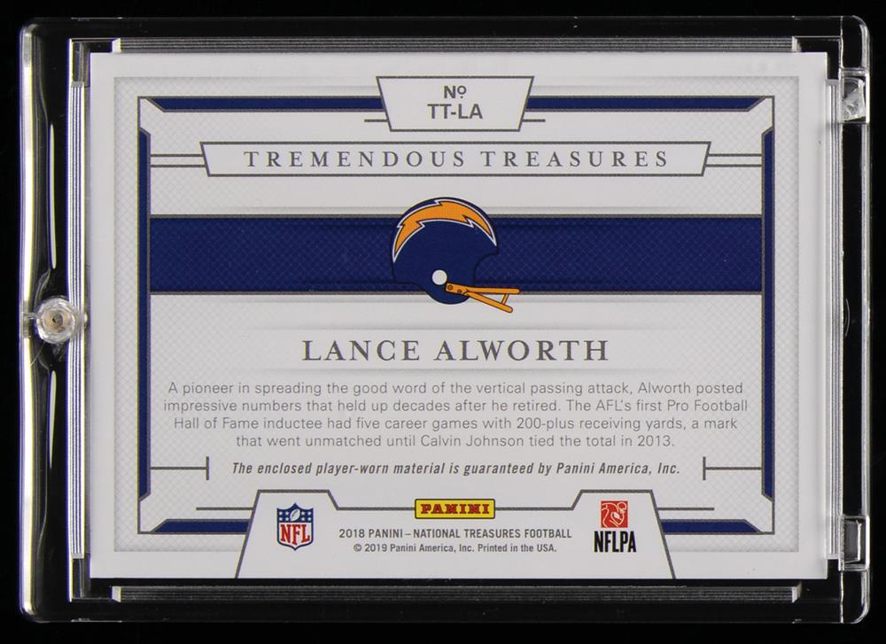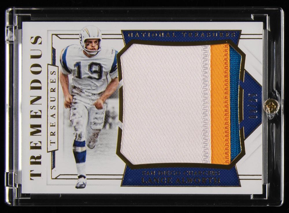 Attractive player-worn patch relic of San Diego Chargers Hall of Famer Lance Alworth, numbered 9/25. featuring a huge three-color swatch in the classic Chargers colors.