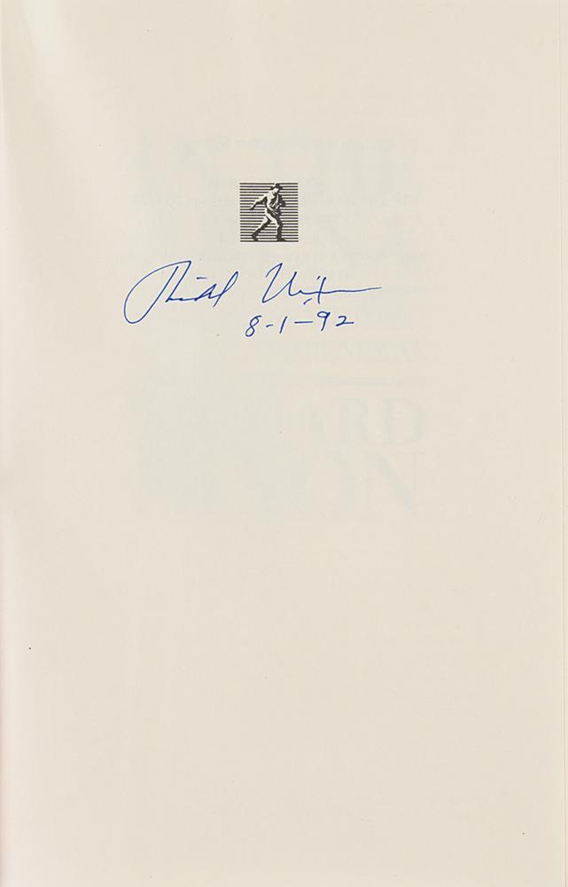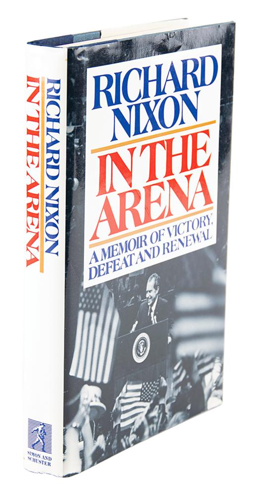 Signed book: In the Arena. First edition. NY: Simon & Schuster, 1990. Hardcover with dust jacket, 6.5 x 9.5, 384 pages. Signed on an opening page in blue ink, "Richard Nixon, 8-1-92." In fine condition. Accompanied by a transmittal letter from Nixon's secretary.