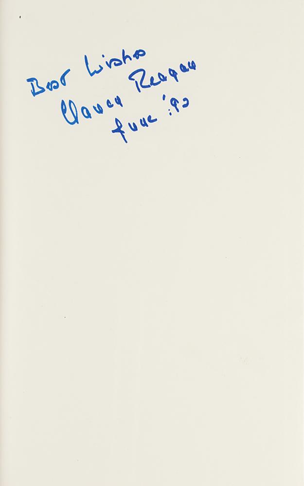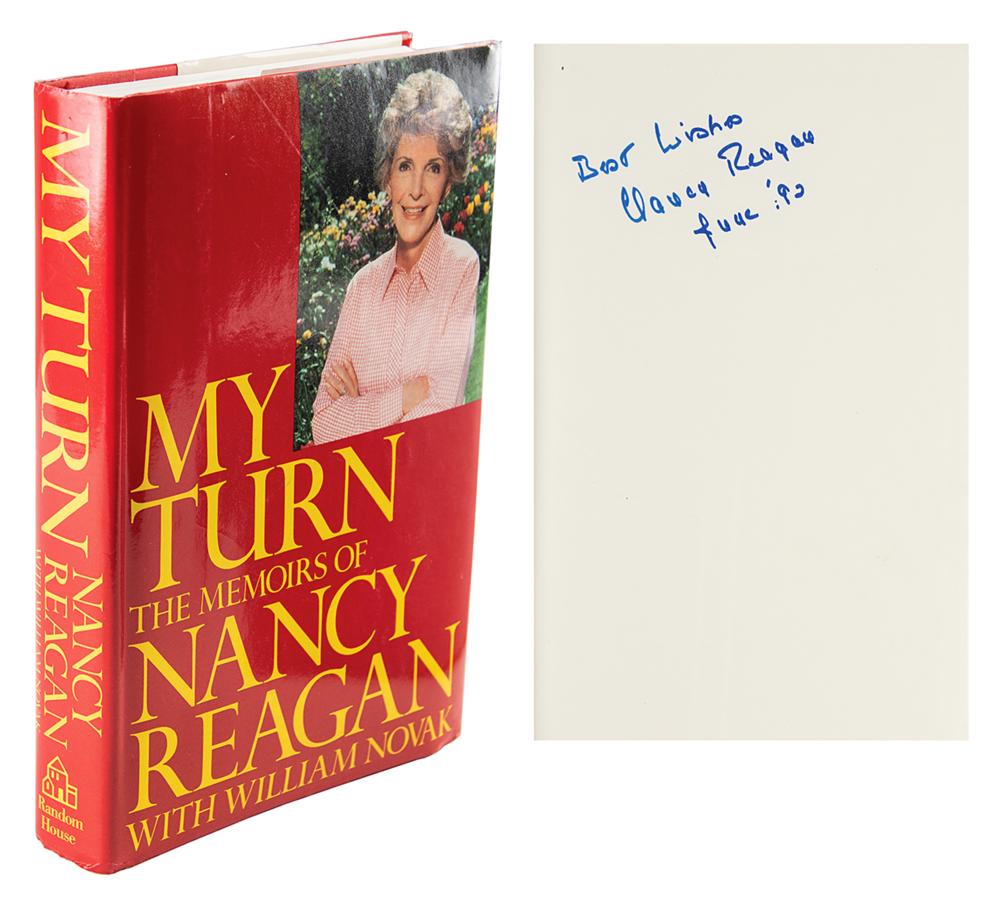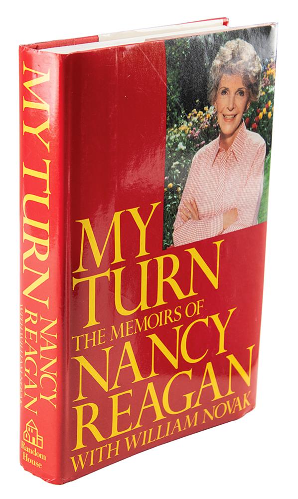 Signed book: My Turn: The Memoirs of Nancy Reagan. First edition. NY: Random House, 1989. Hardcover with dust jacket, 6.5 x 9.5, 384 pages. Signed on the first free end page in blue felt tip, "Best wishes, Nancy Reagan, June '92." In fine condition.