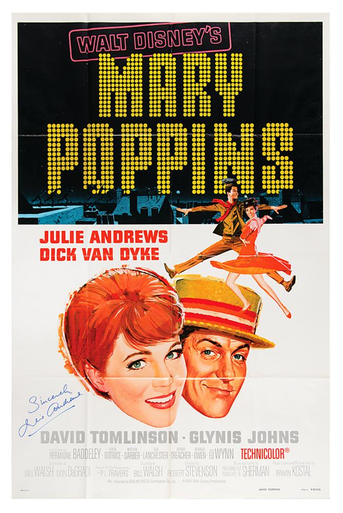 Delightful color 27 x 41 one sheet movie poster for the 1964 Walt Disney classic Mary Poppins, signed in blue felt tip, "Sincerely, Julie Andrews." In fine condition, with intersecting folds as issued.